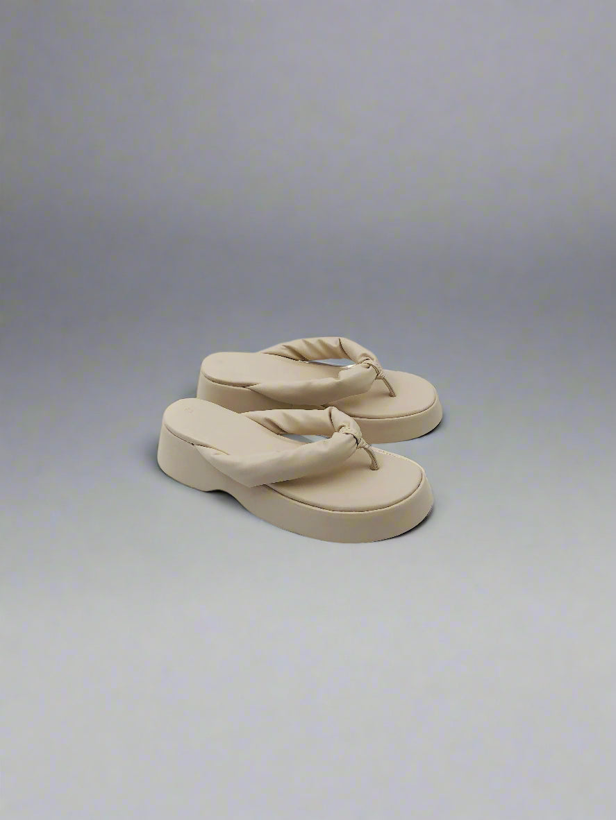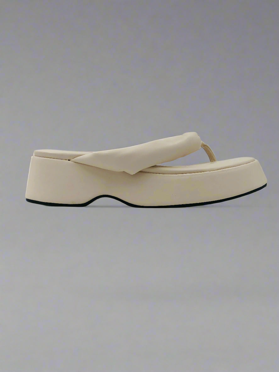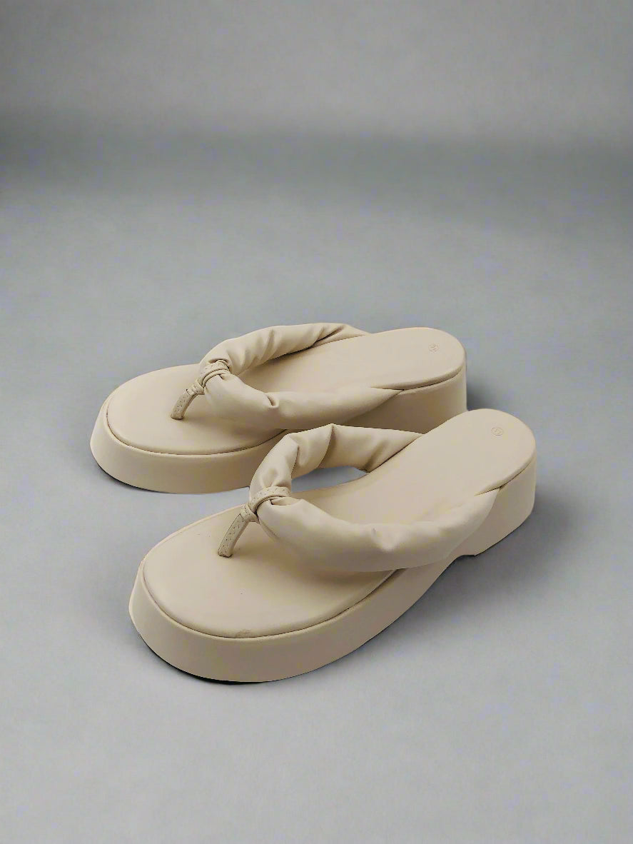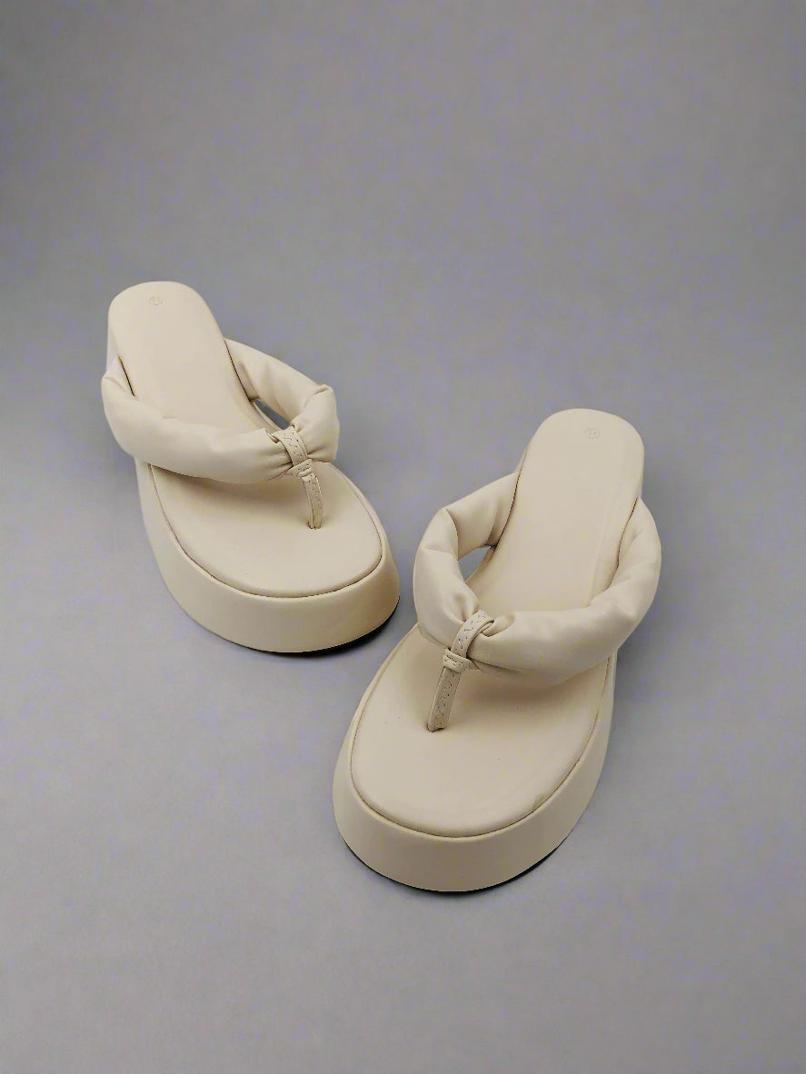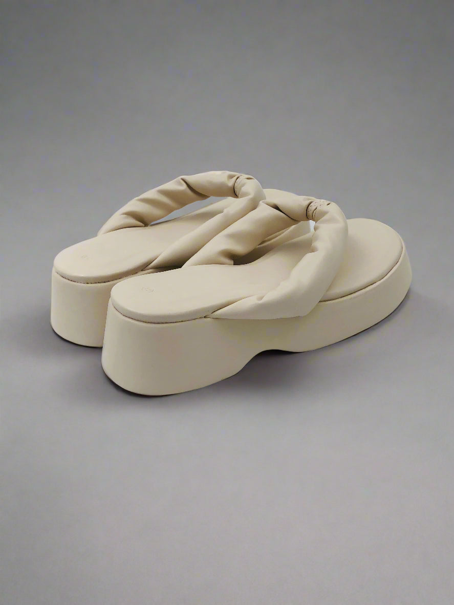 White platform flip-flop sandals with a chunky sole and padded straps. A versatile choice that pairs effortlessly with a variety of outfits.