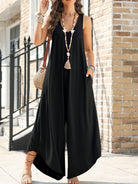 Women Sleeveless Ruched V Neck Flared Wide Leg Overall Jumpsuits With Pockets
