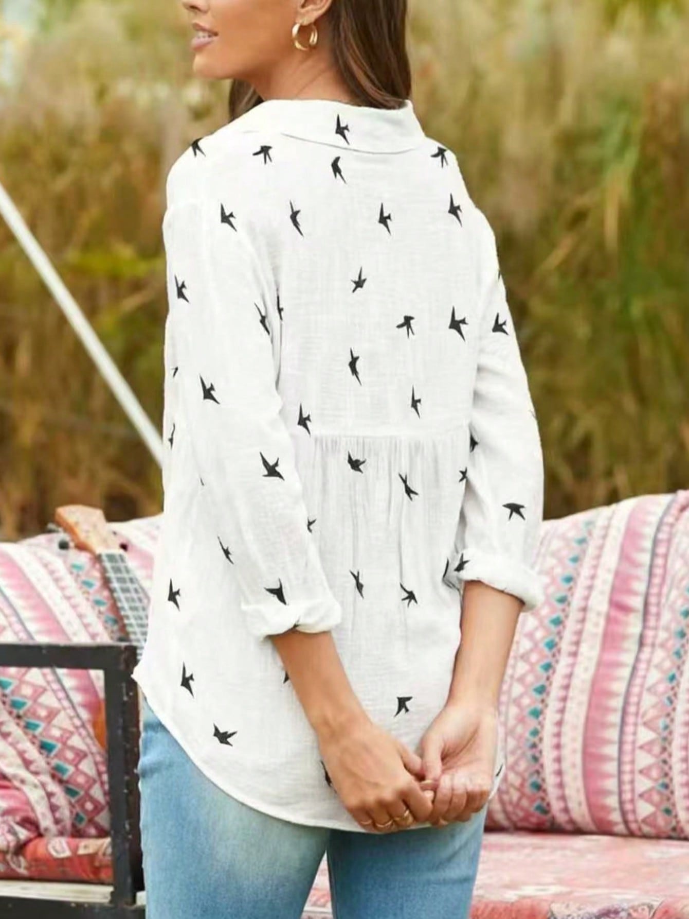Women's Casual Bird Print Long Sleeve Shirt - Music Festival Style