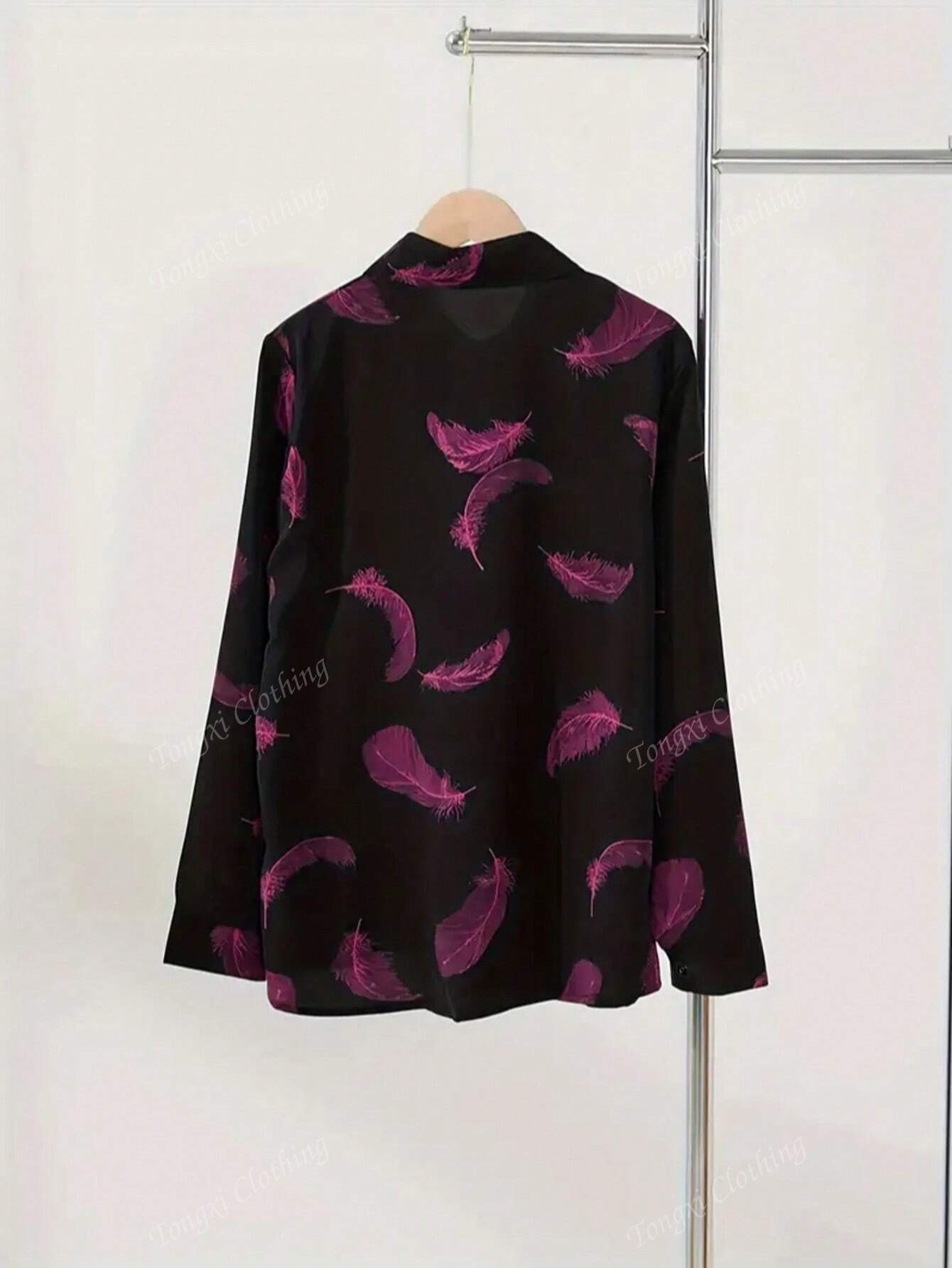 Women's Casual Feather Print Elegant Long Sleeve Blouse, Ladies Tops For Spring And Summer