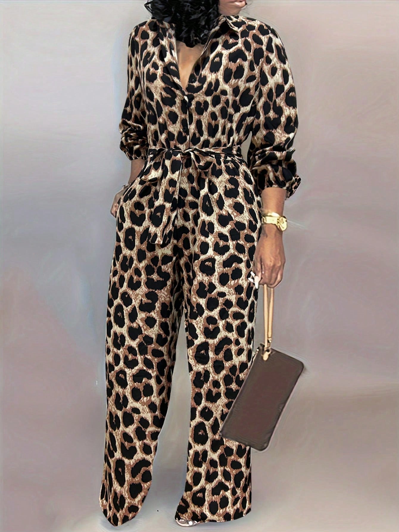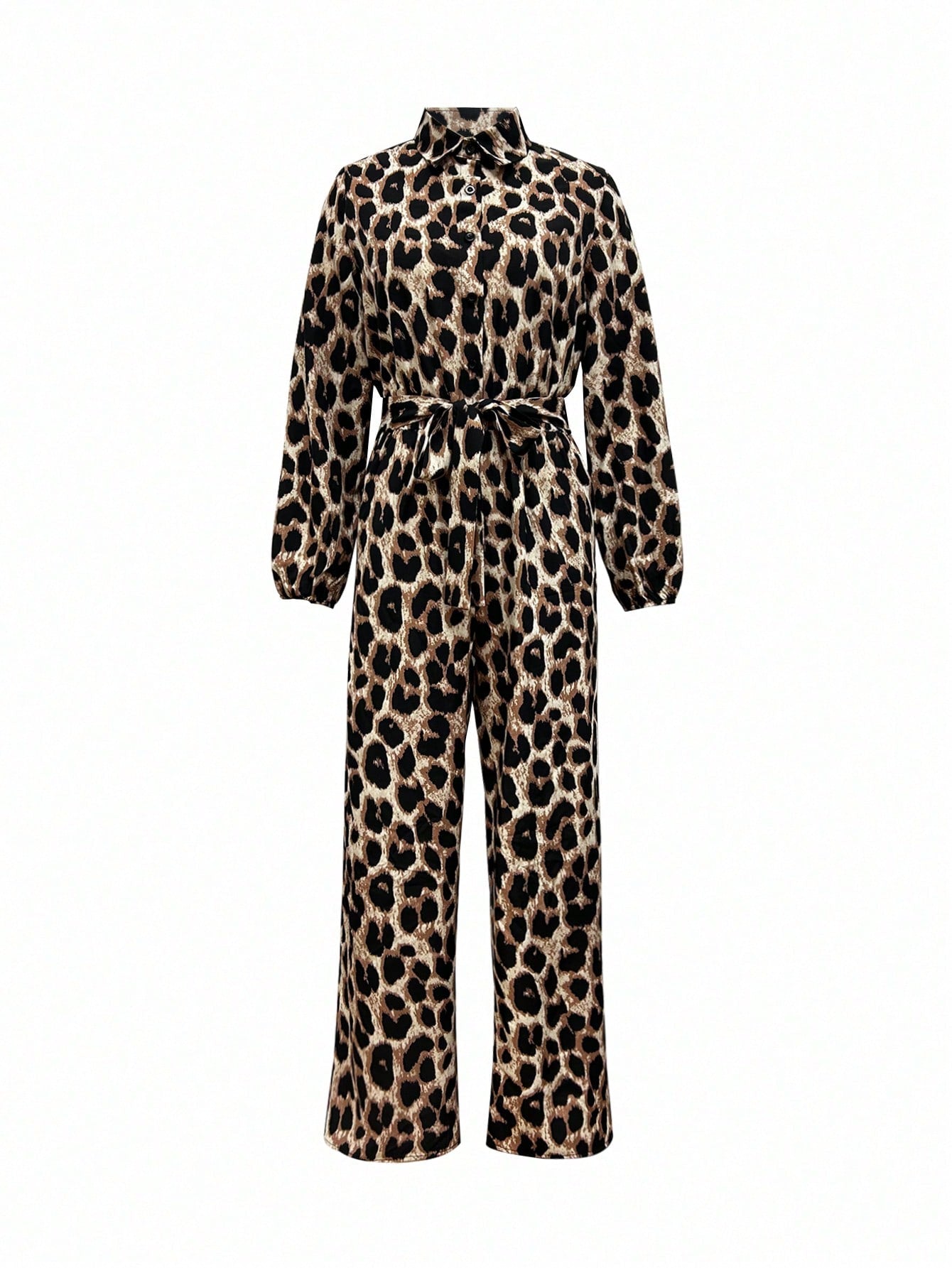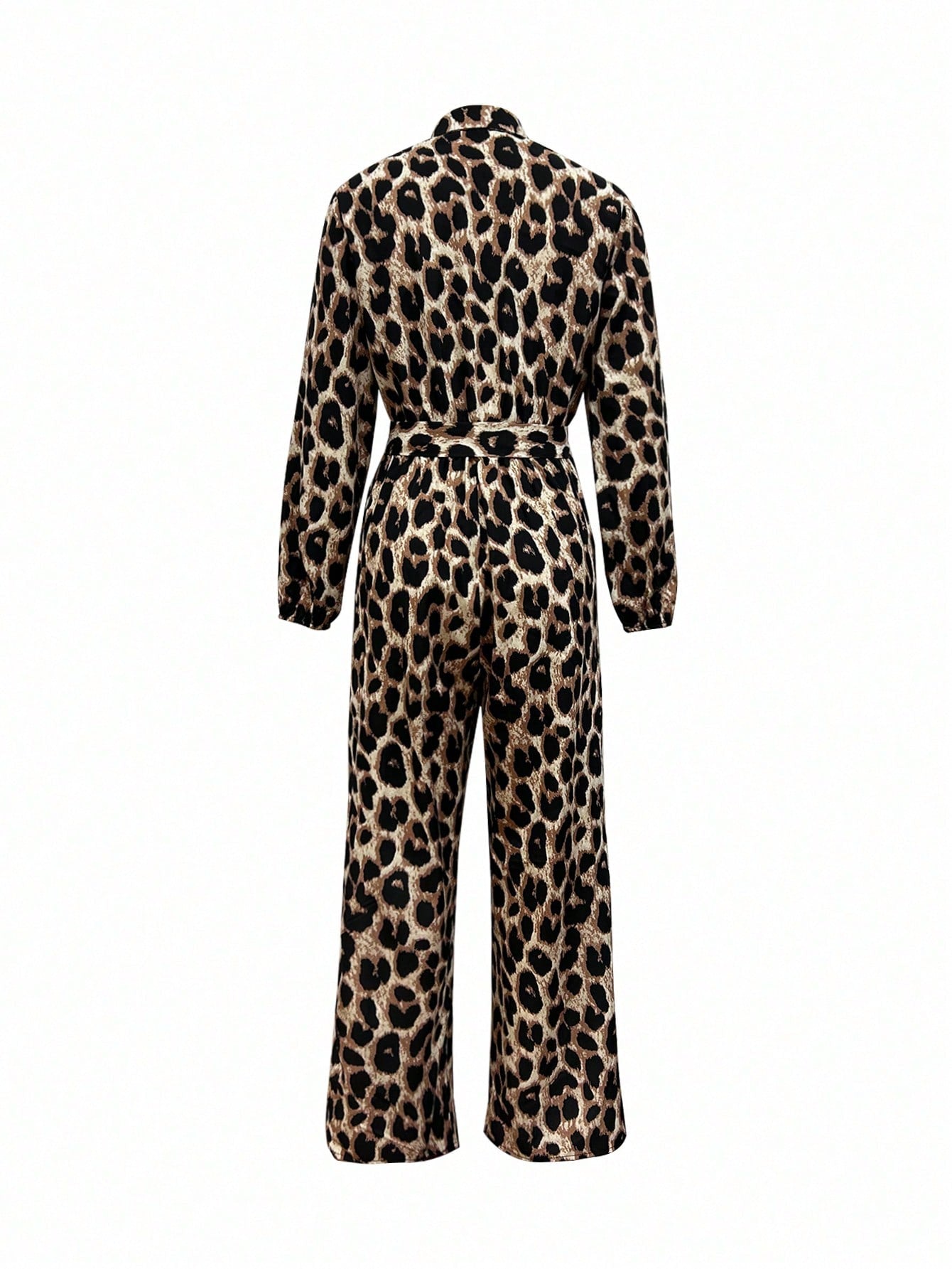 Women's Casual Leopard Print Long Sleeve Jumpsuit Without Belt