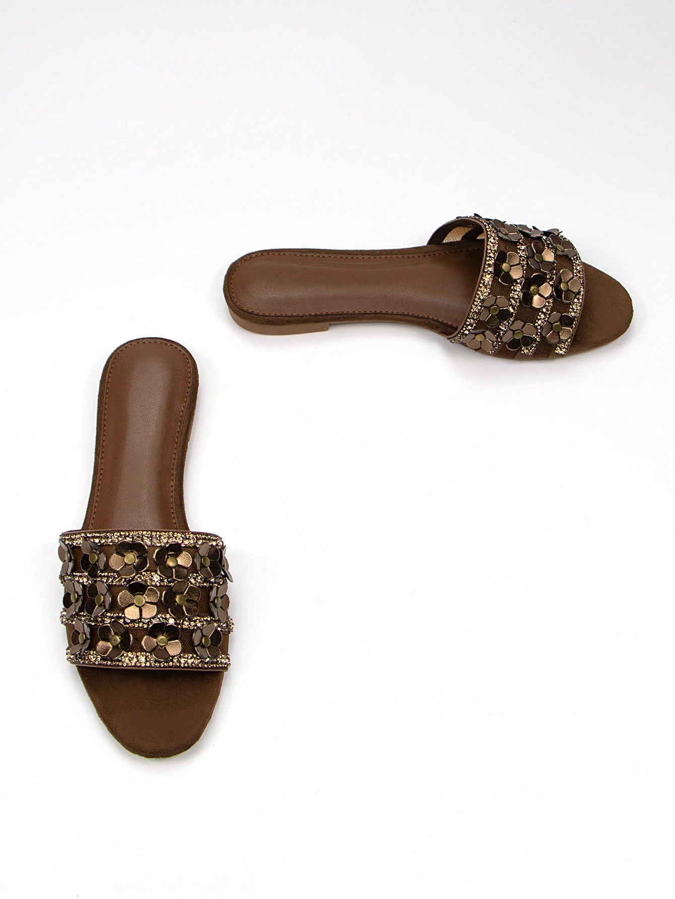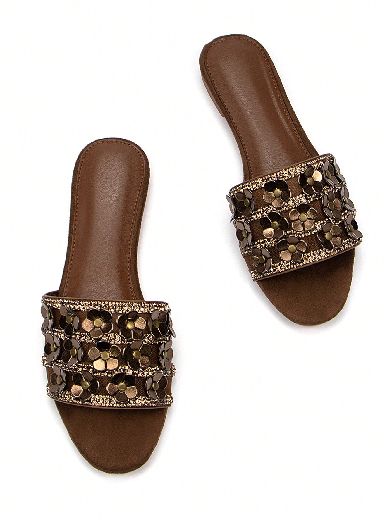 women Women's Glamorous Hollow-Out Full Rhinestone Studded Flower Decor Chocolate Brown Faux Suede Mesh Fashion Round Toe Comfortable Daily Party Flat Slide Sandals