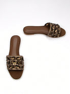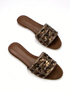 Women's Glamorous Hollow-Out Full Rhinestone Studded Flower Decor Chocolate Brown Faux Suede Mesh Fashion Round Toe Comfortable Daily Party Flat Slide Sandals