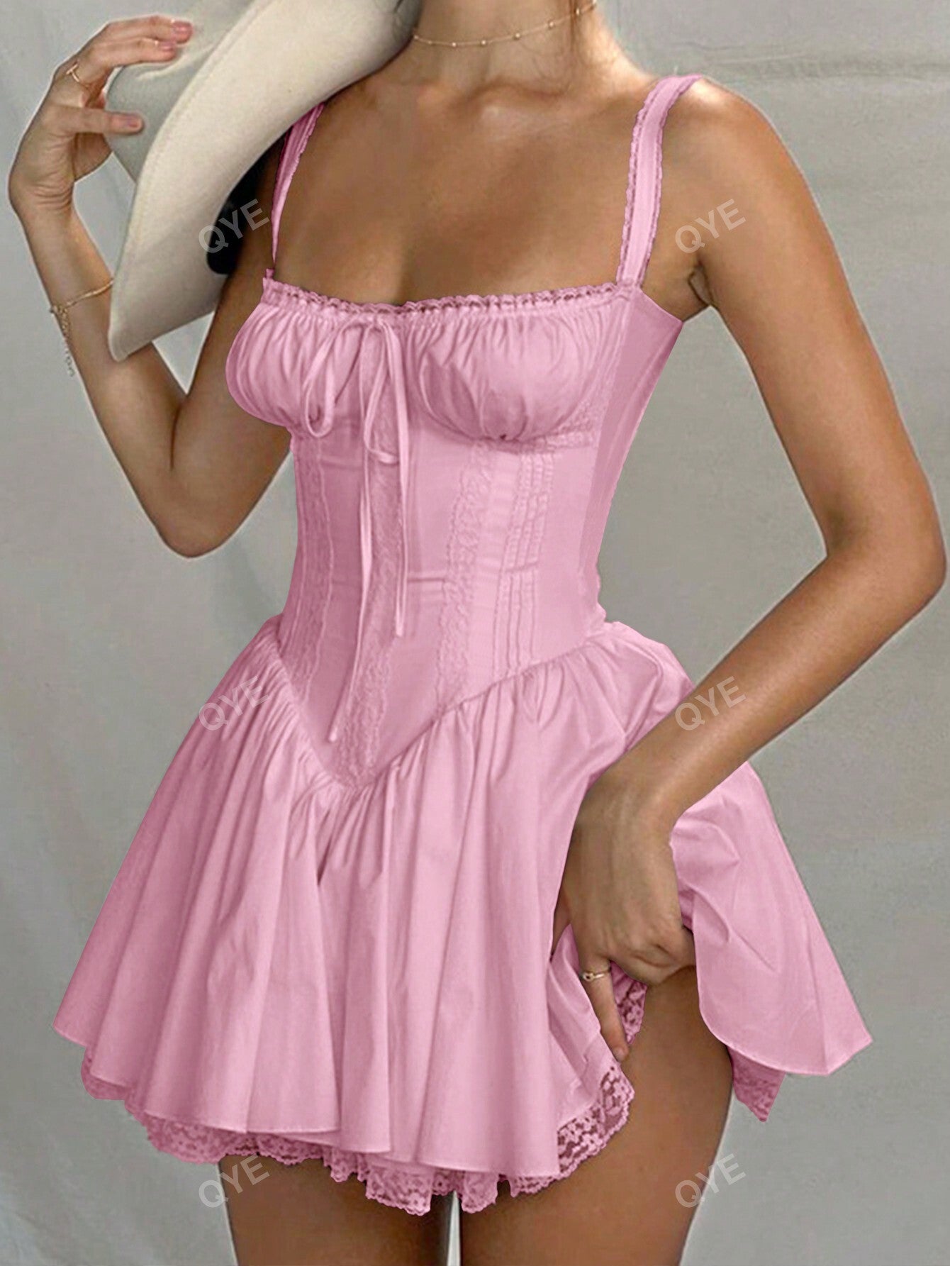Women's Solid Color Sleeveless Ruffle Ruched Lace Trim Mini Dress