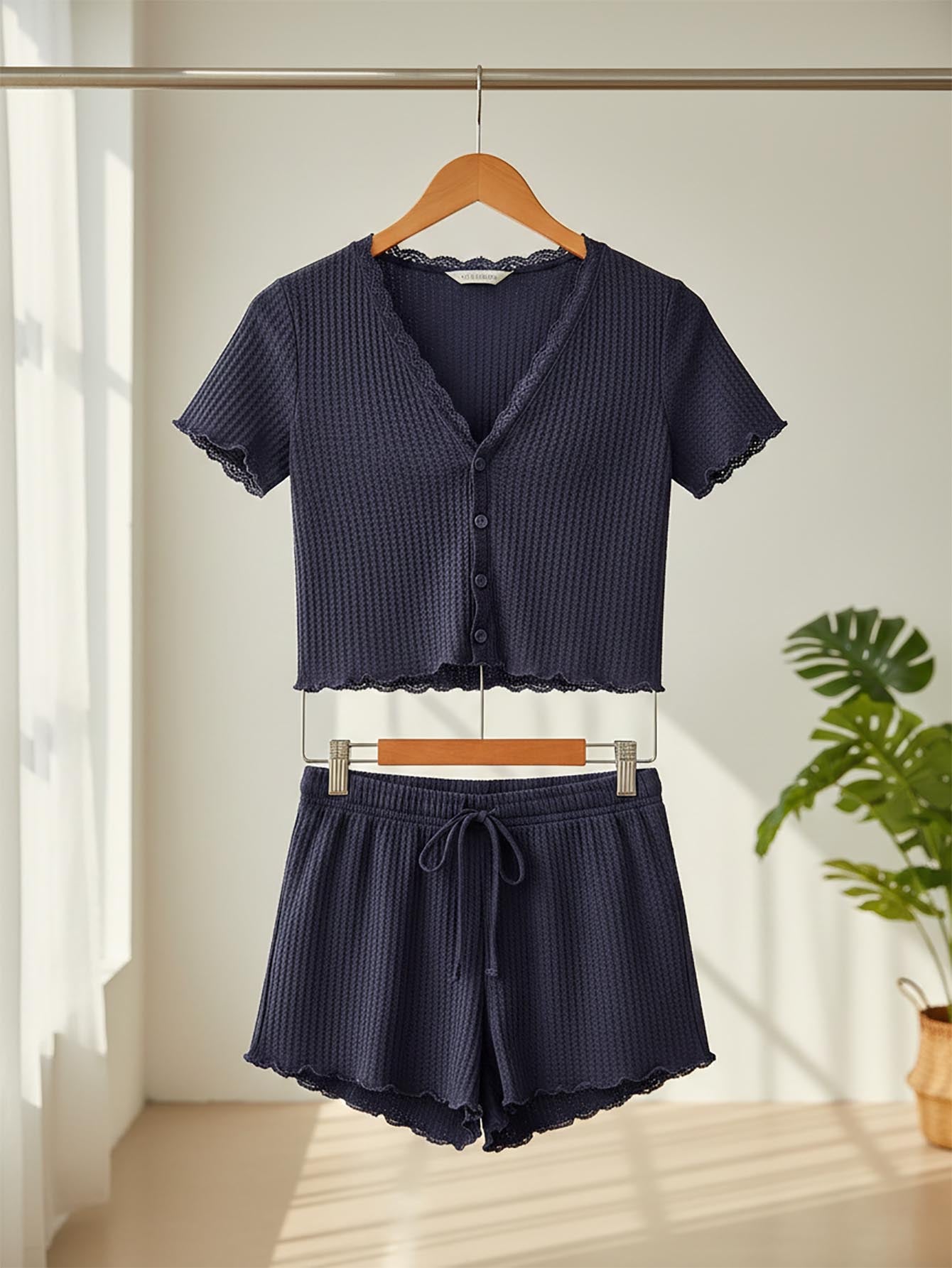 Women's Solid Color Waffle Knit Ruffled Pajama Set