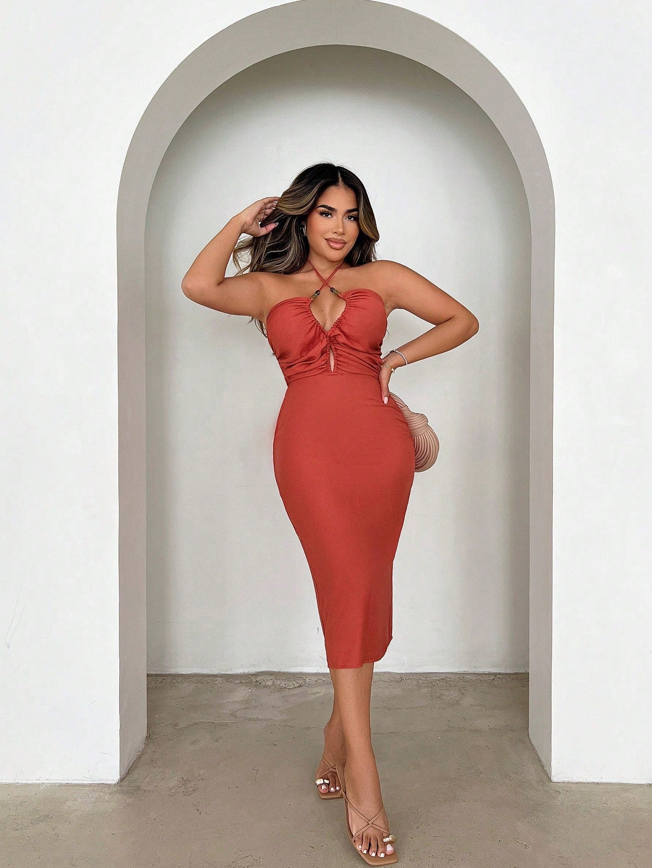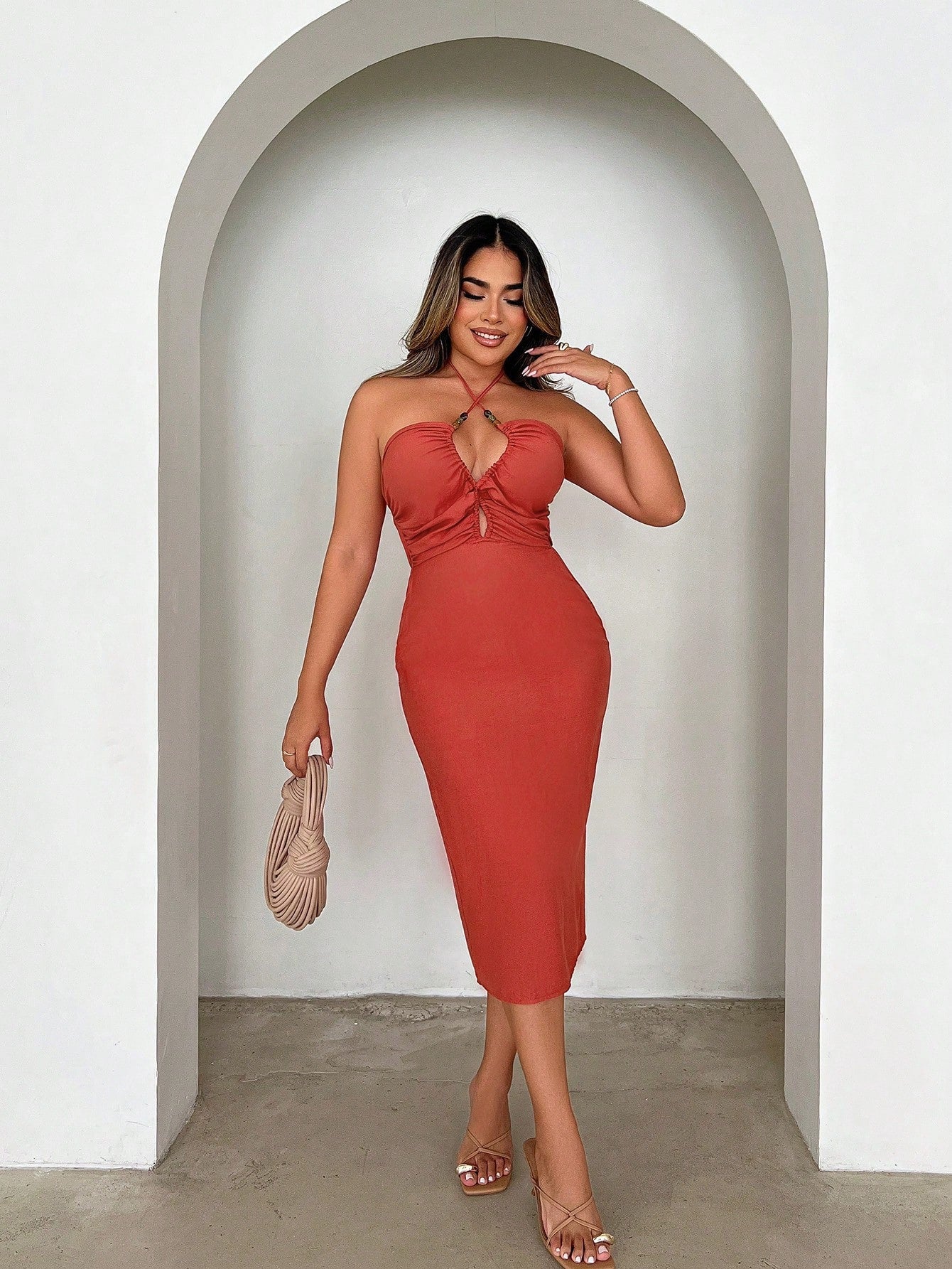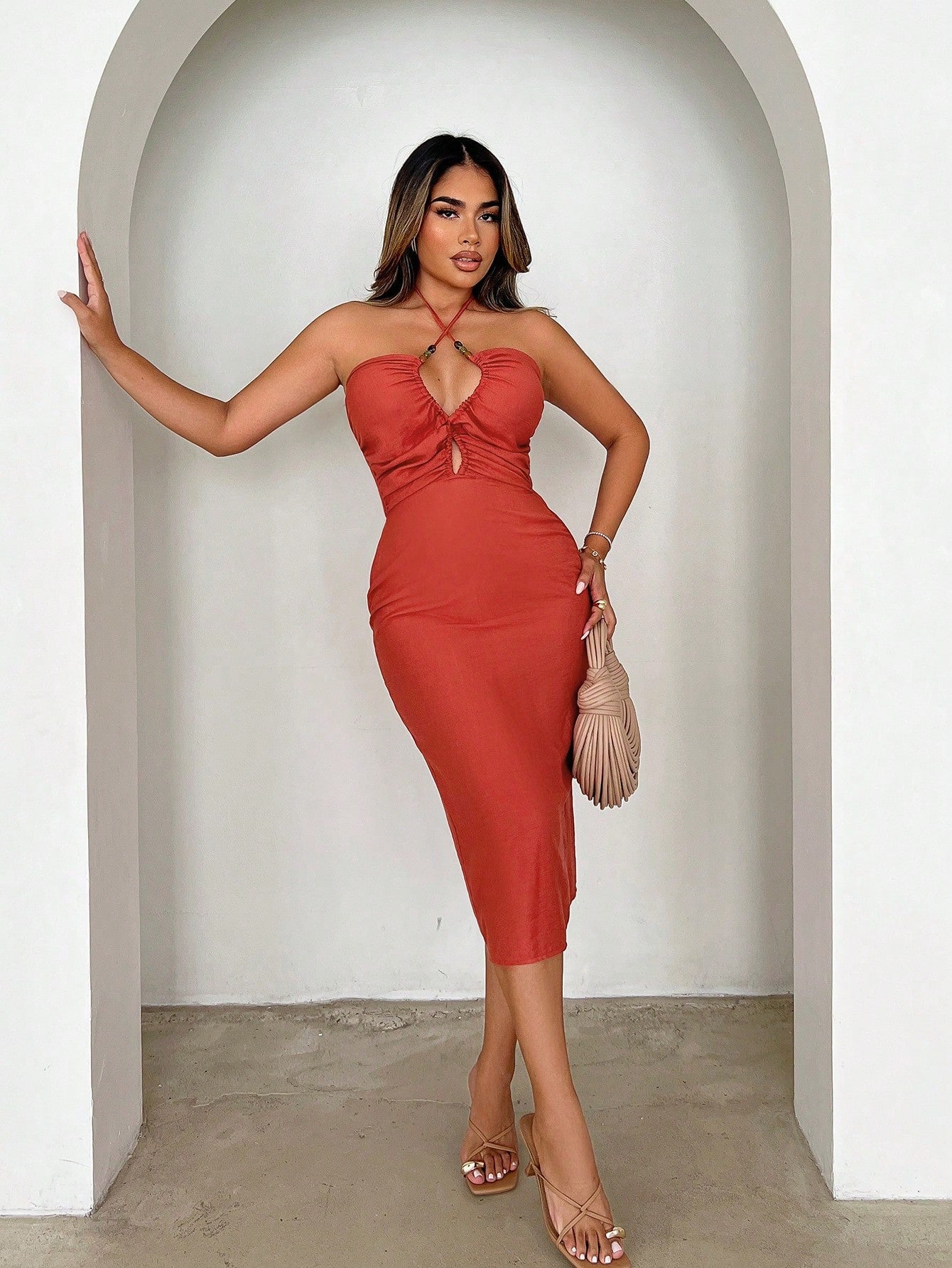 Xyvia Women's Sexy Solid Color Backless Halter Mid-Calf Dress, Summer