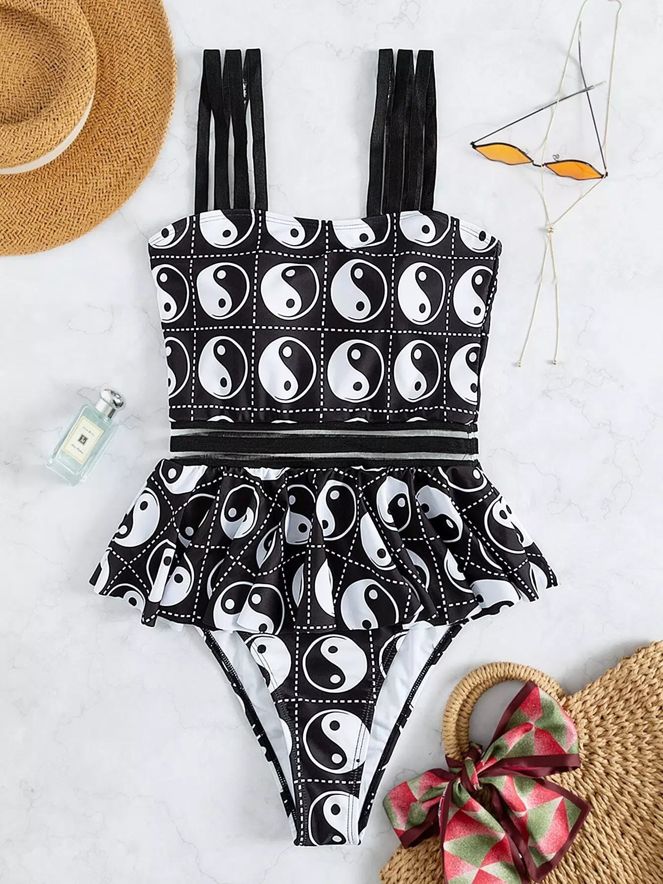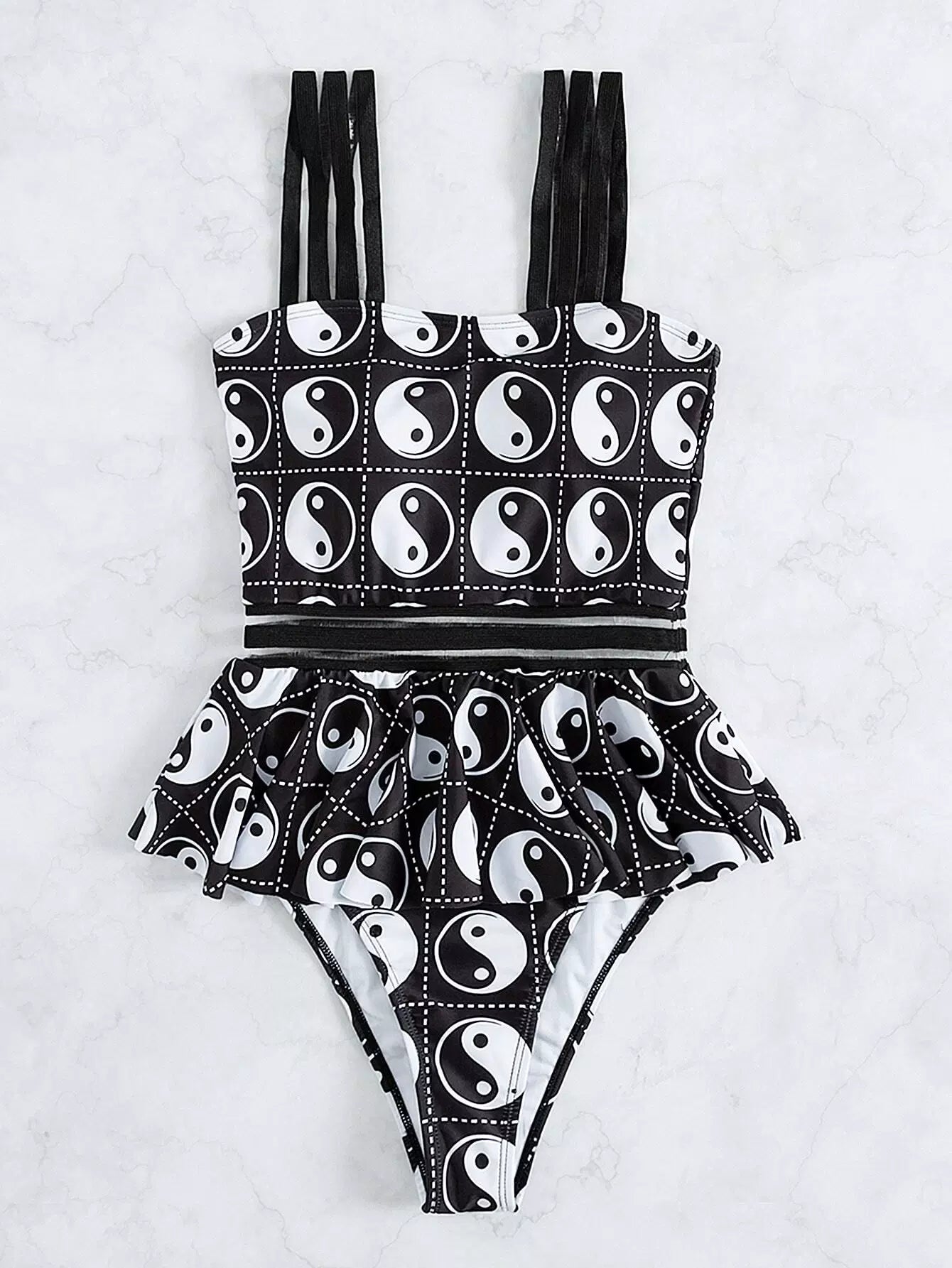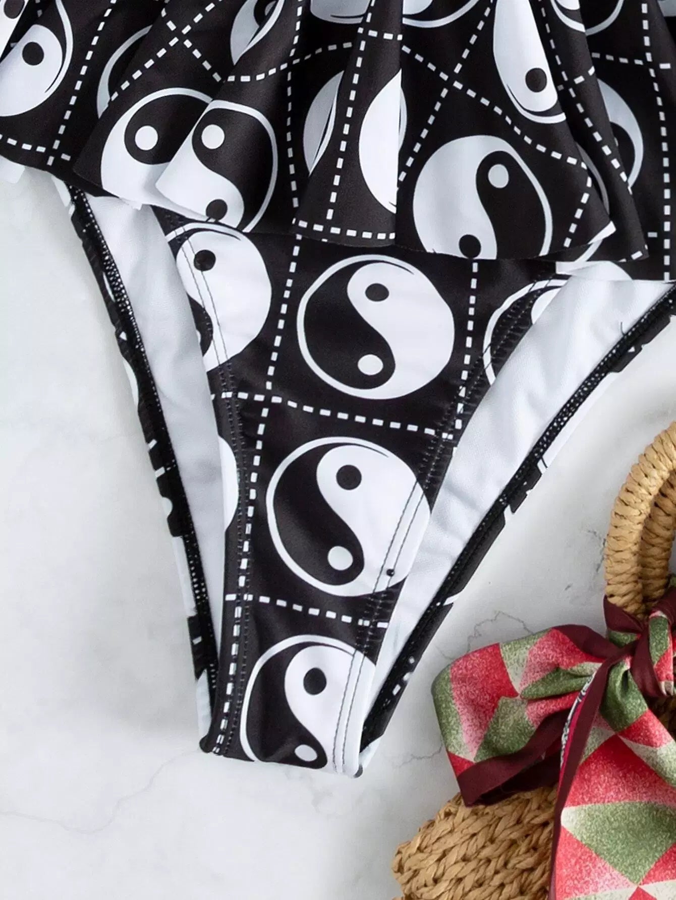 Yin & Yang Print Ruffle Hem One Piece Swimsuit