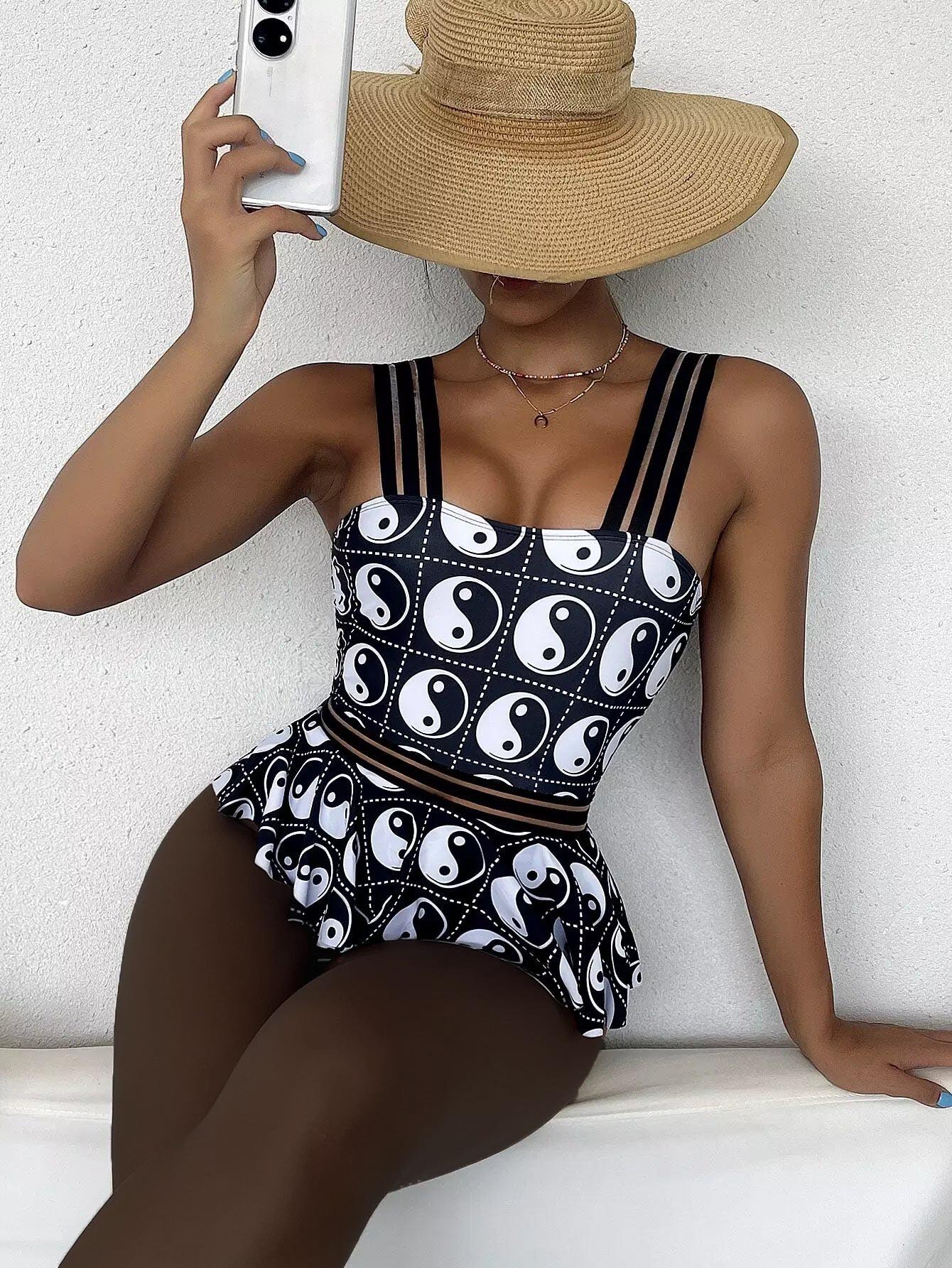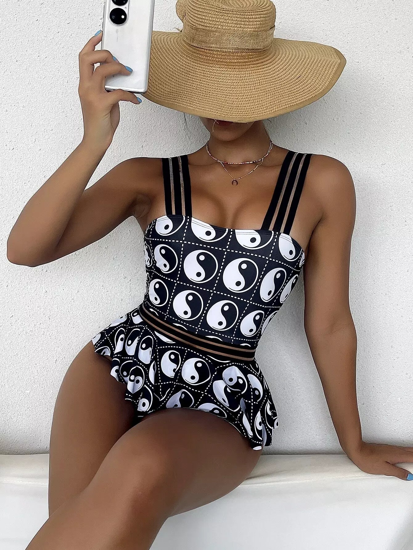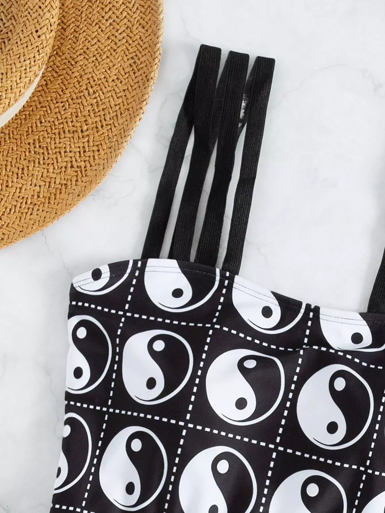 Yin & Yang Print Ruffle Hem One Piece Swimsuit