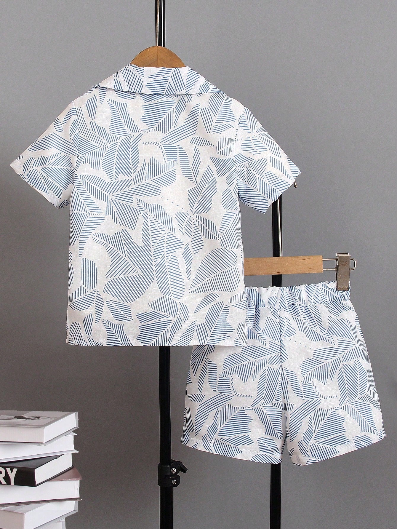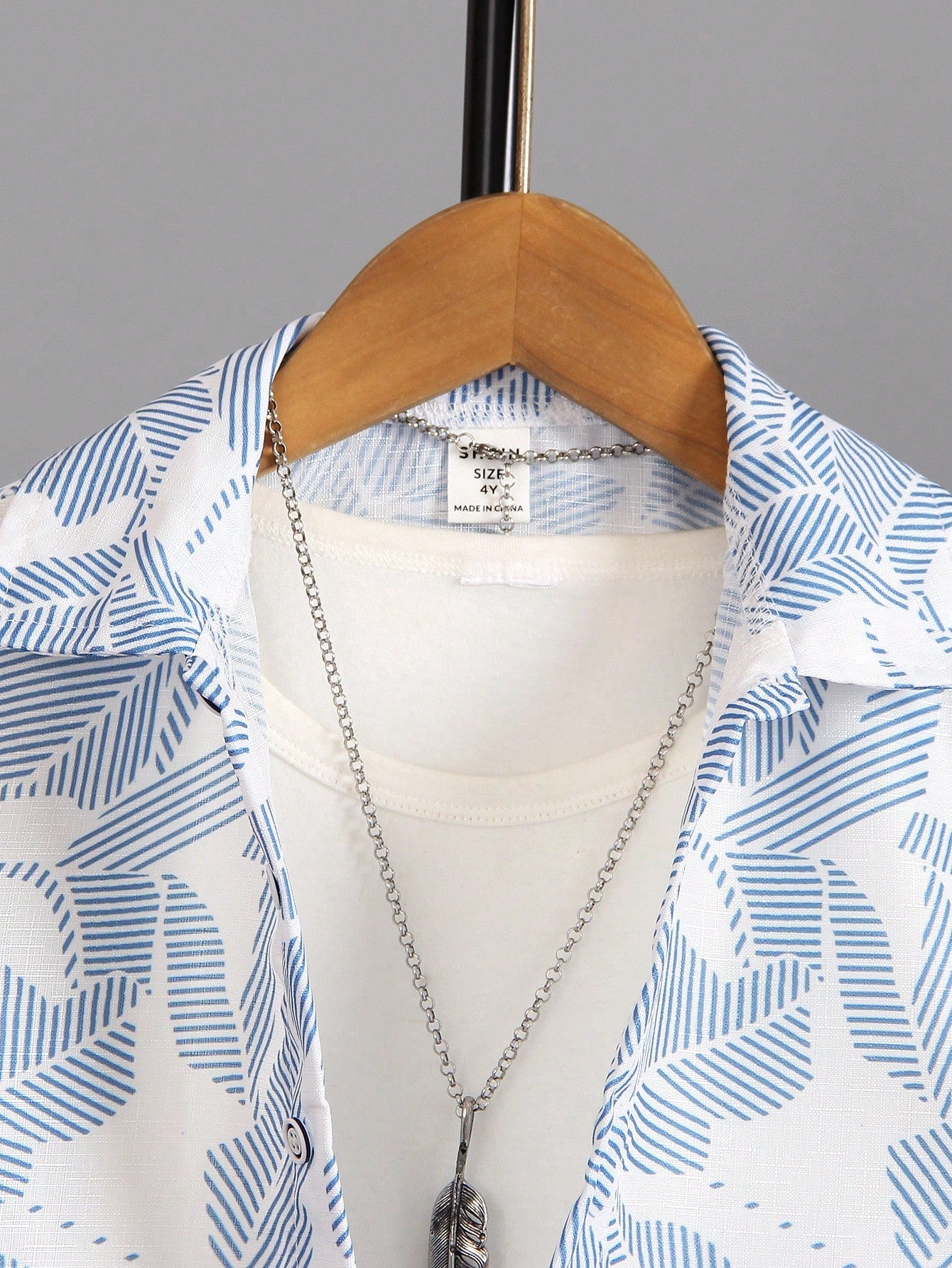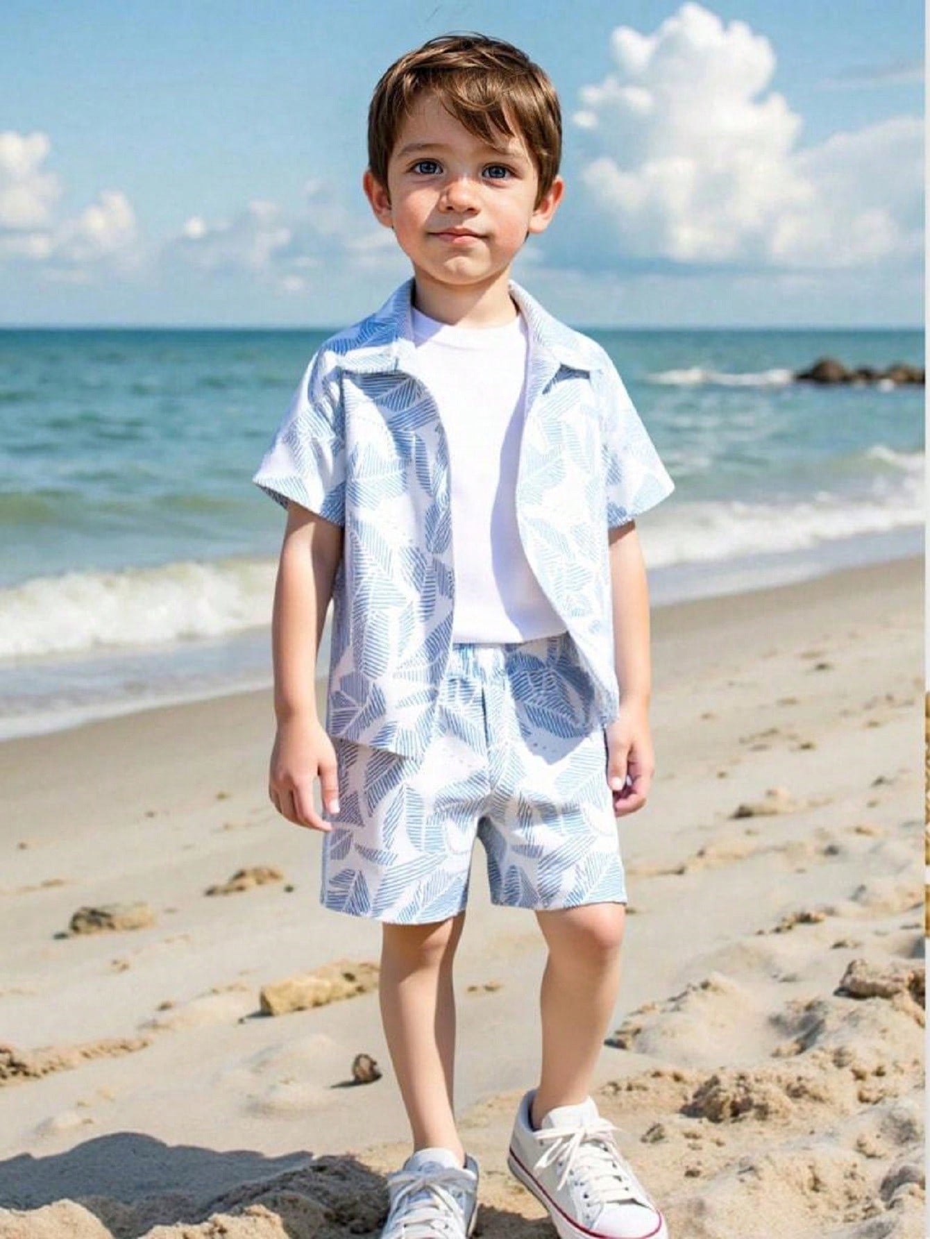 Young Boy 2-Piece Linen Tropical Plant Printed Short Sleeve Shirt And Shorts Set, Suitable For Holiday
