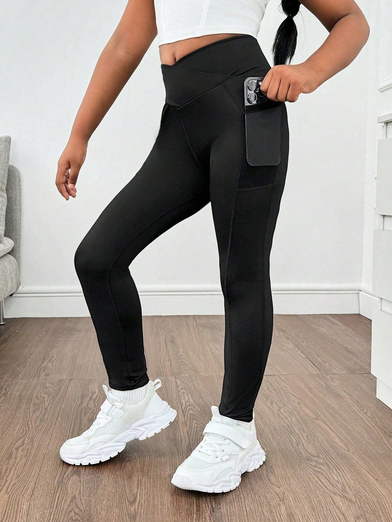 kids Young Girl Minimalist Comfy Casual Sports Waist Phone Pocket Tight Leggings