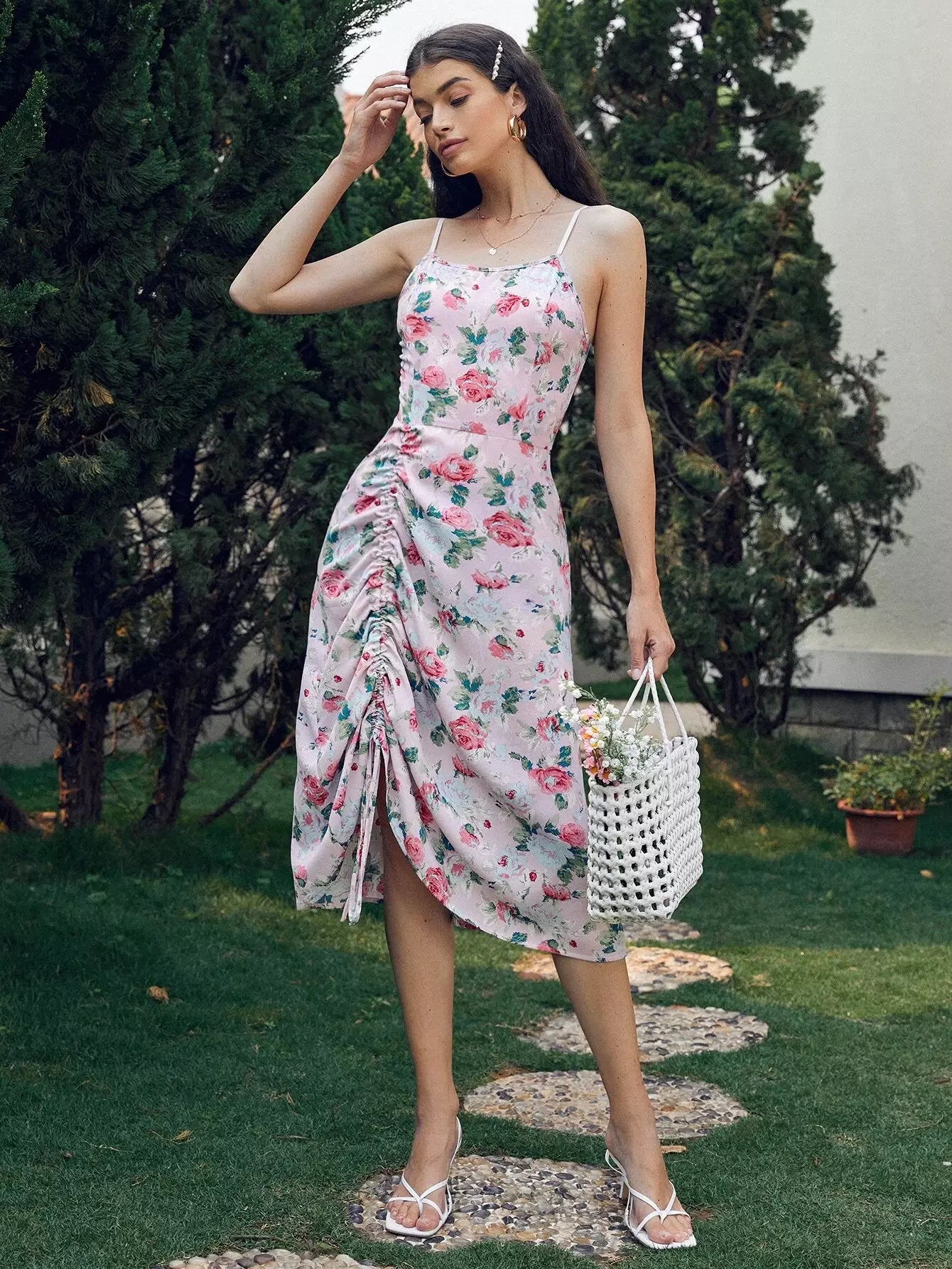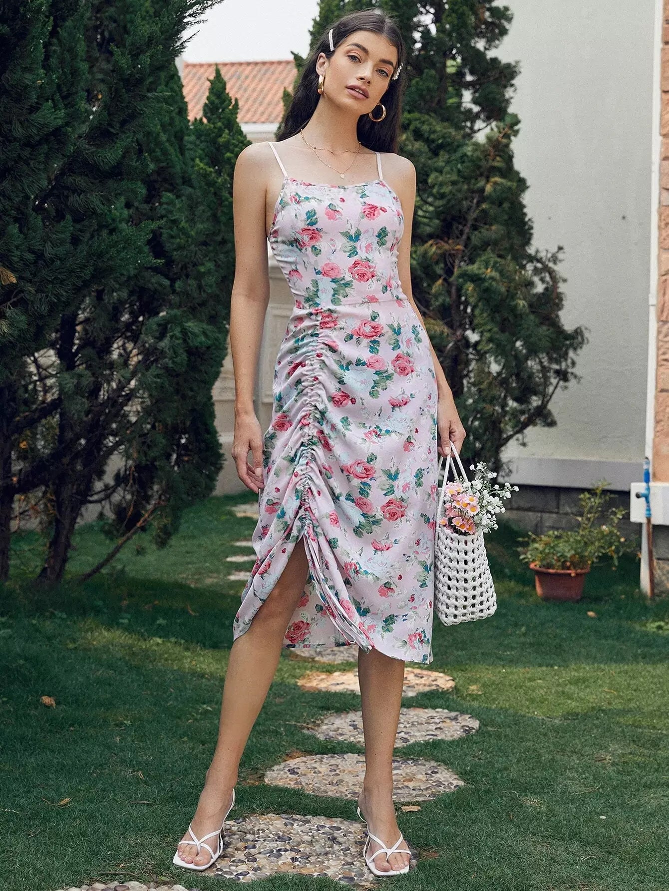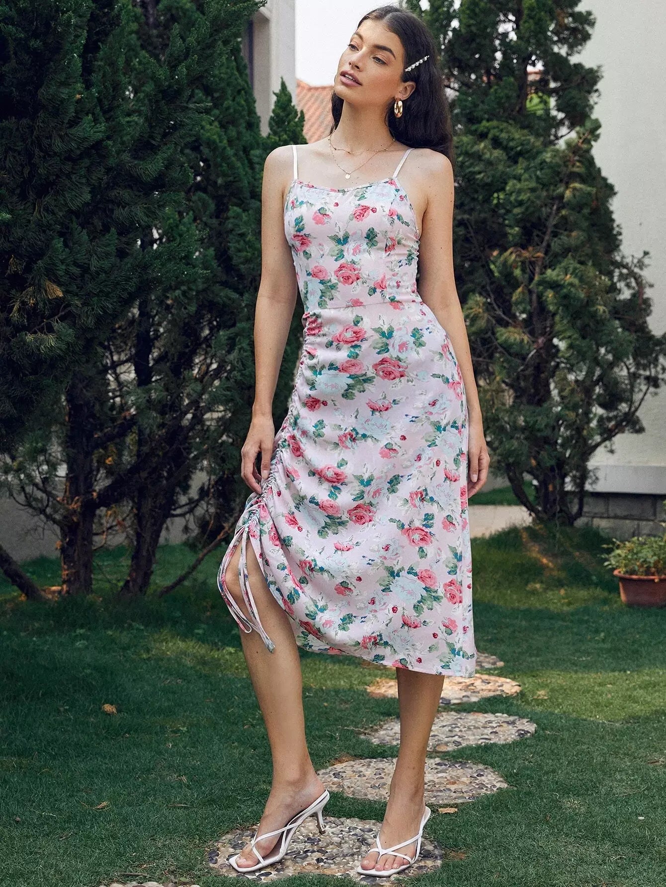 Zip Back Ruched Drawstring Knot Floral Cami Dress