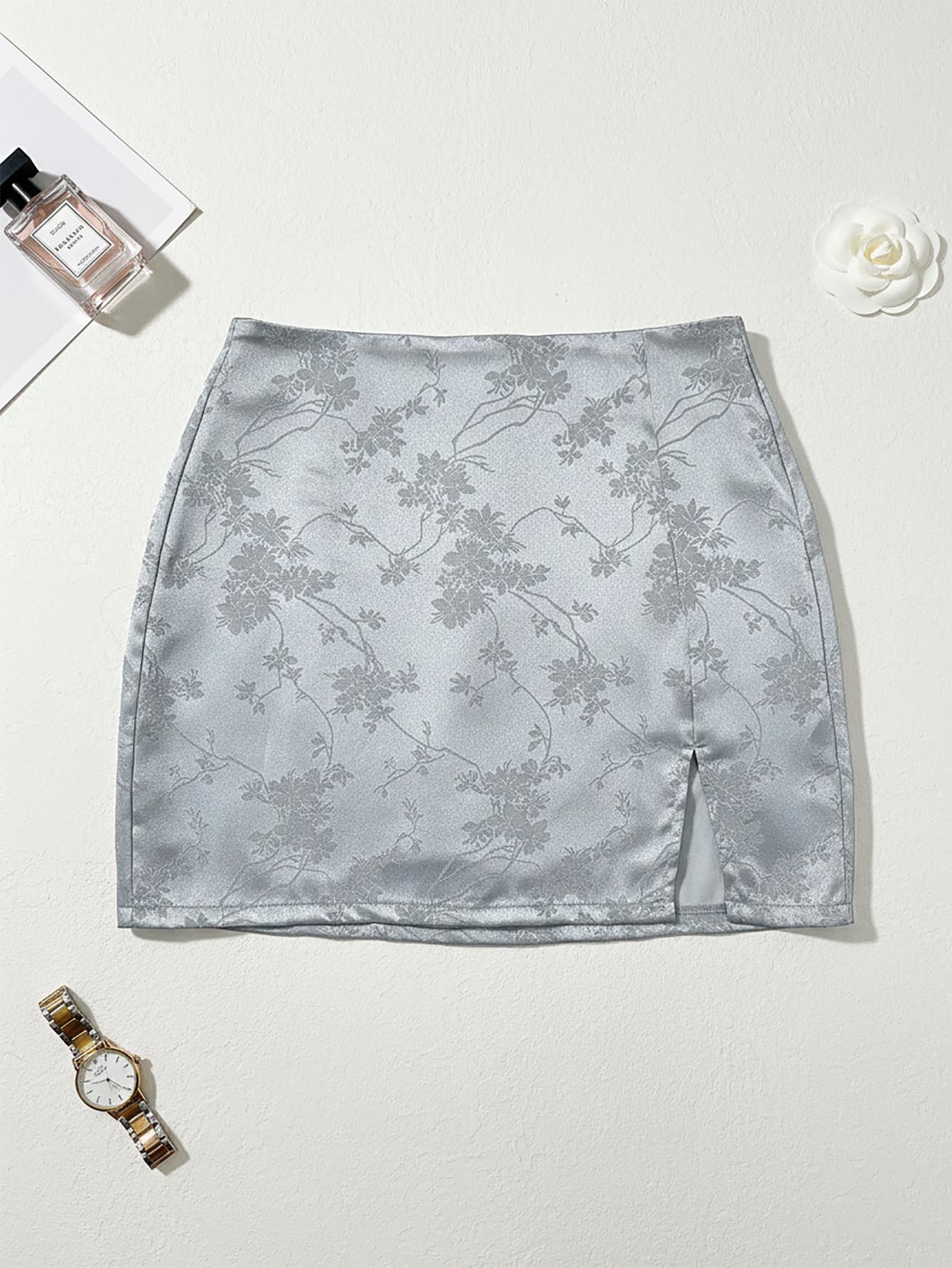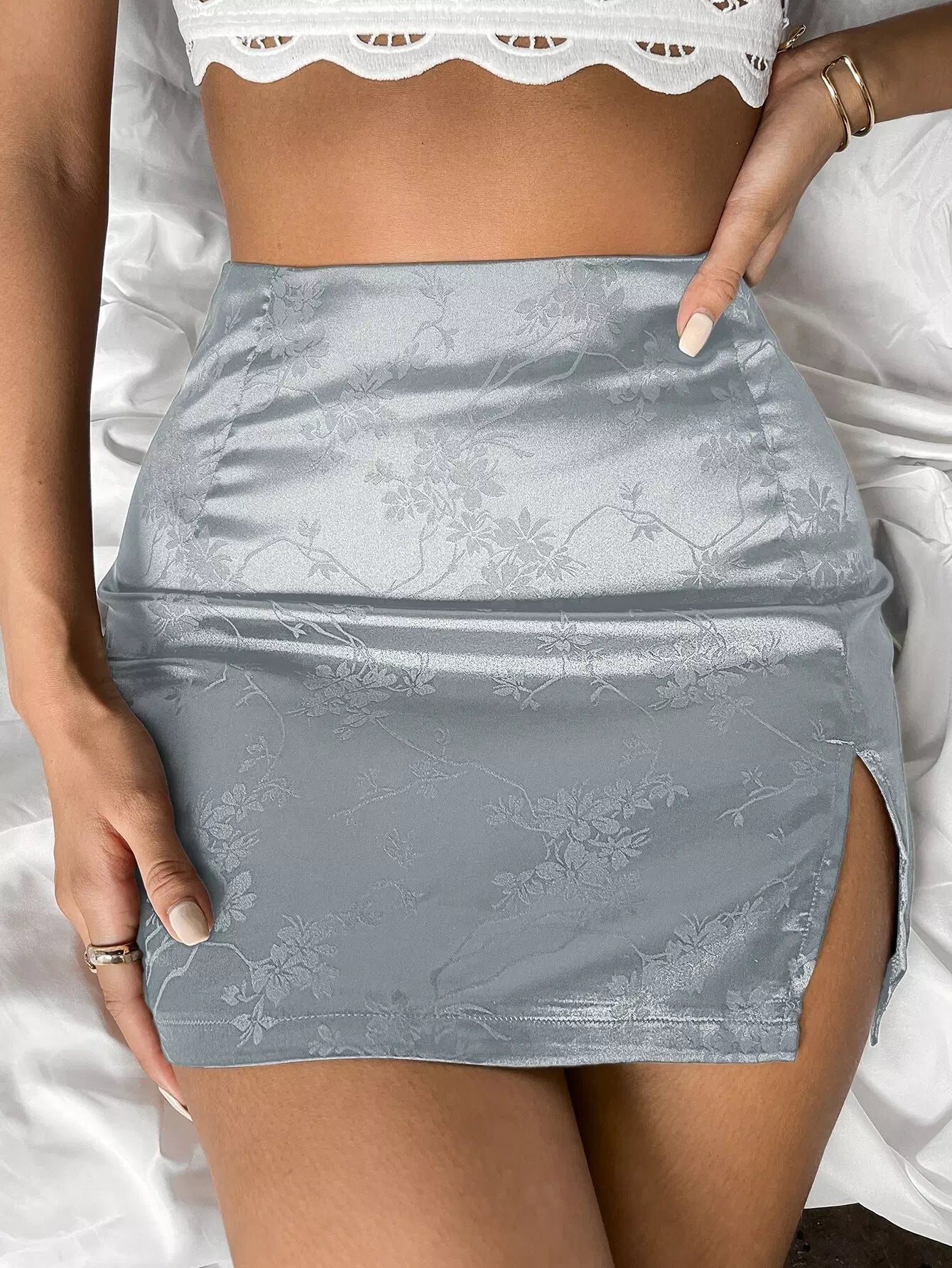 Zip Back Split Hem Jacquard Satin Skirt