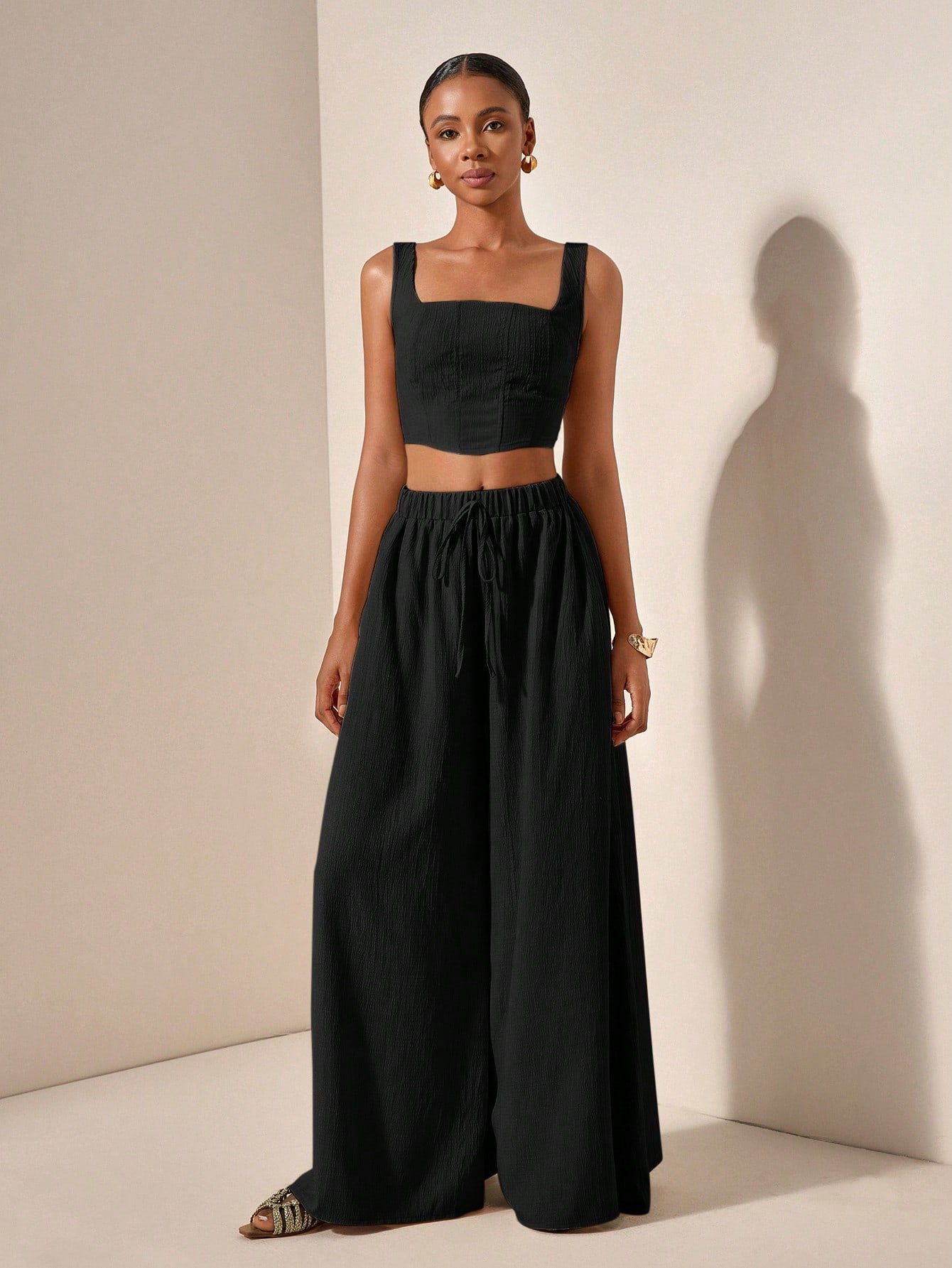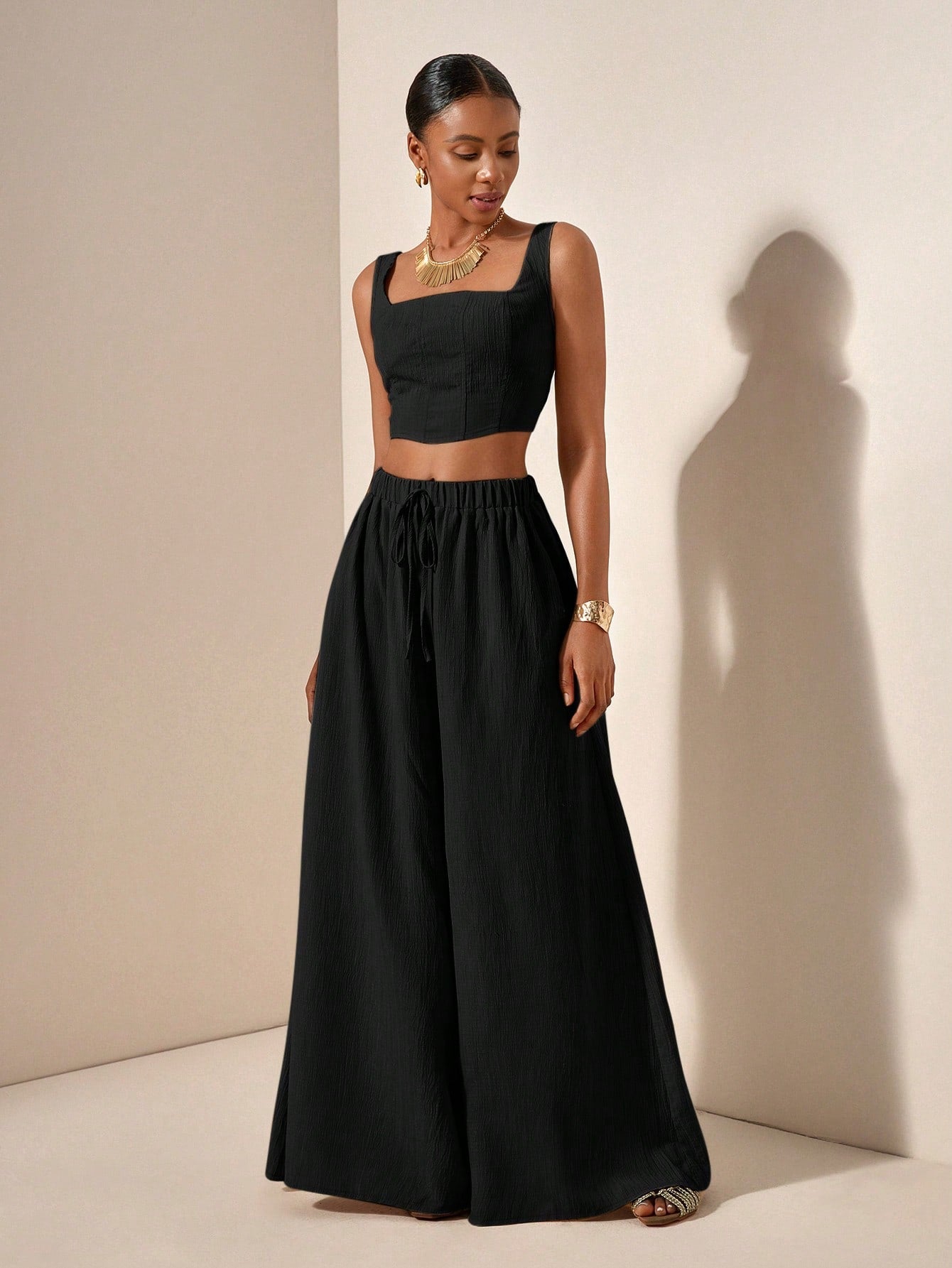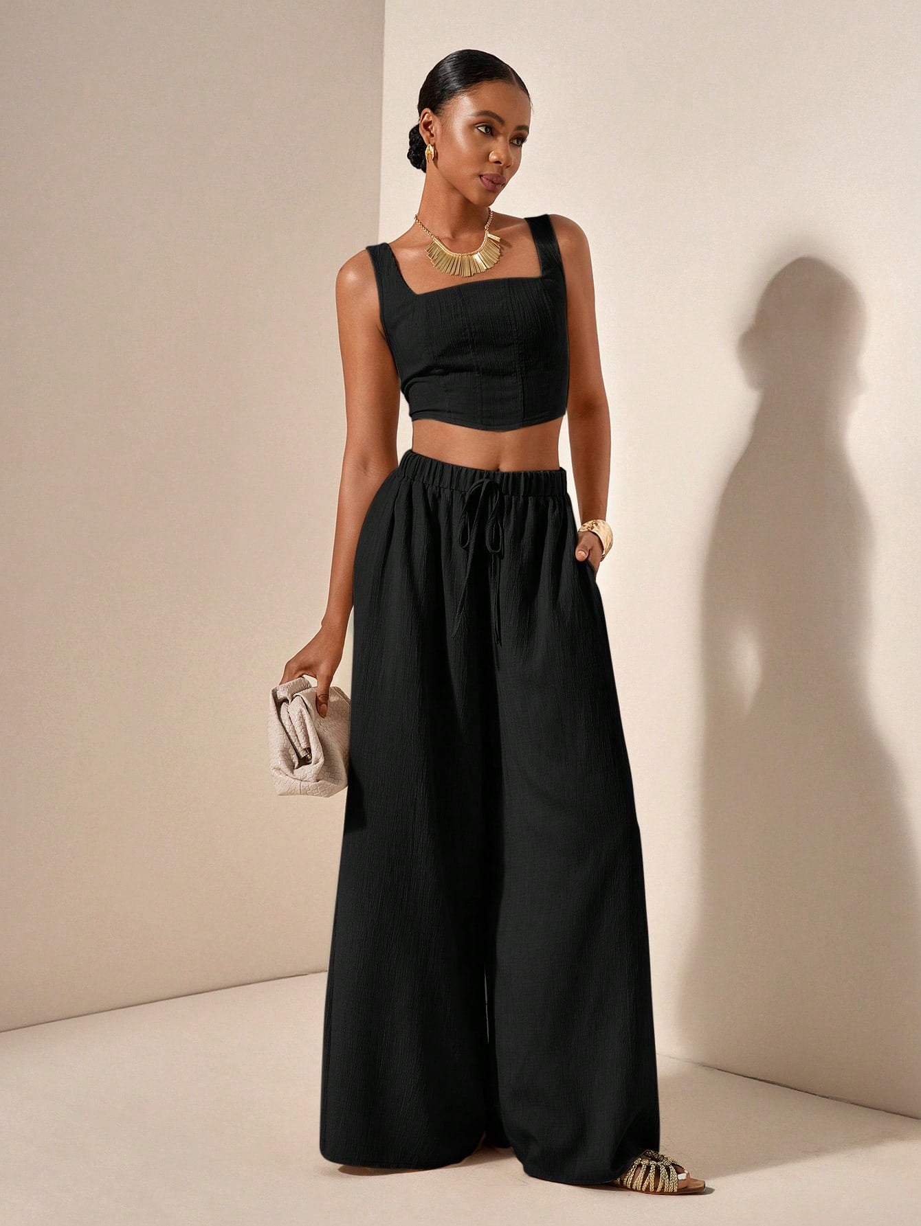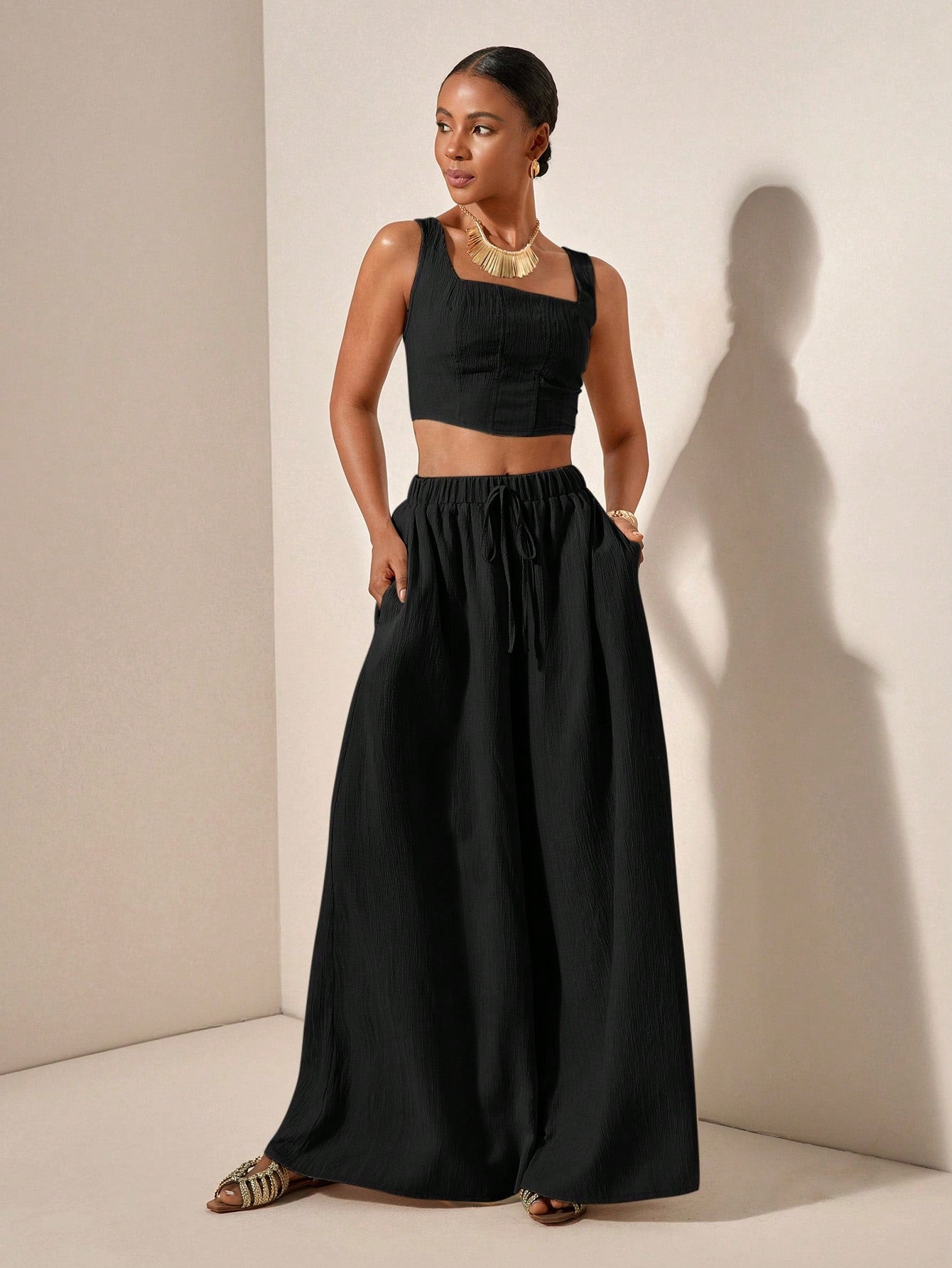 Zivah New 2pcs Set: Fishbone Strap Top And Wide Leg Pants With Pockets